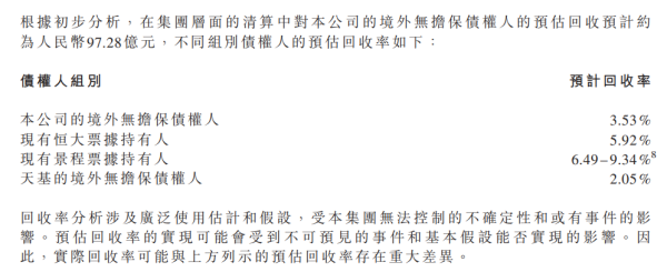 如果重组不成功,恒大被迫走向破产清算的道路,债权人能收回的债务金额只有约97.28亿人民币,也就是14亿美元,预计回收率仅为2.05%~9.34%。