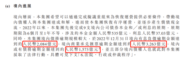 光是这次插在境外债务重组的公告里,披露出来的境内逾期债务,就有约6920亿人民币的巨大体量,是境外债务的5倍有余。