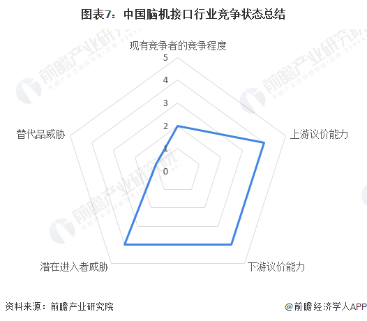 根据以上分析,对各方面的竞争情况进行量化,5代表最大,0代表最小,目前我国脑机接口行业五力竞争总结如下: