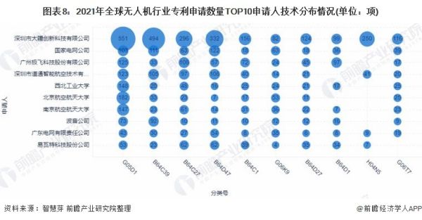 趋势方面,2010-2014年,全球前十大无人机专利申请人申请的无人机专利数差距不大,2015年起,深圳市大疆创新科技有限公司无人机专利申请数量与其他申请人差距逐渐拉大。2020年,深圳市大疆创新科技有限公司无人机专利申请数量达到462项,为排名第二的国家电网公司的无人机专利申请量的2.5倍以上。
