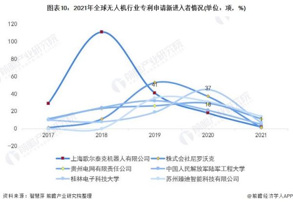 全球新进入者有6位,分别是上海歌尔泰克机器人有限公司、株式会社尼罗沃克、贵州电网有限责任公司、中国人民解放军陆军工程大学、桂林电子科技大学、苏州臻迪智能科技有限公司,其中上海歌尔泰克机器人有限公司申请的无人机专利数量最多,为201项。