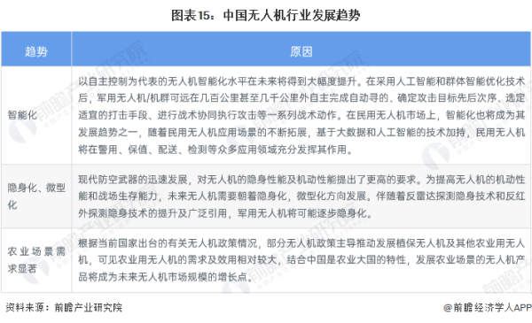 根据当前无人机发展政策、时代发展背景,以及无人机市场需求情况来看,中国无人机将可能往智能化、因深化、微型化发展,同时农业场景对无人机需求较为显著。