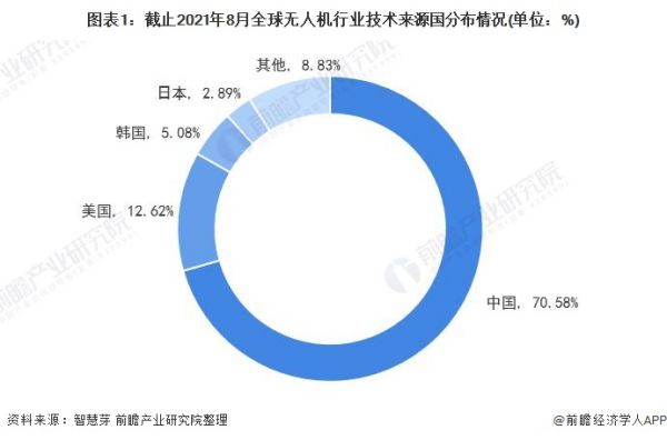 目前,全球无人机第一大技术来源国为中国,中国无人机专利申请量占全球无人机专利总申请量的70.58%;其次是美国,美国无人机专利申请量占全球无人机专利总申请量的12.62%。韩国和日本排名第三和第四,与中国专利申请量差距较大。