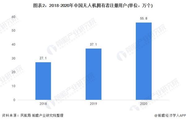 在民航局一系列的管理政策的推动下,我国注册登记无人机规模稳步扩大。据民航局公布的《民航行业发展统计公报》数据,我国无人机注册用户大幅增长。2018-2020年,我国无人机拥有者注册用户持续增长,截至2020年底共有55.8万个注册用户。