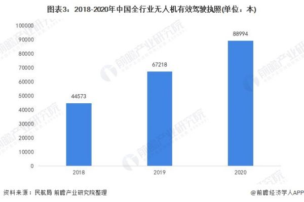 从全行业无人机有效驾驶执照数量来看,2018-2020年我国全行业无人机有效驾驶执照从4.46万本增至8.90万本。