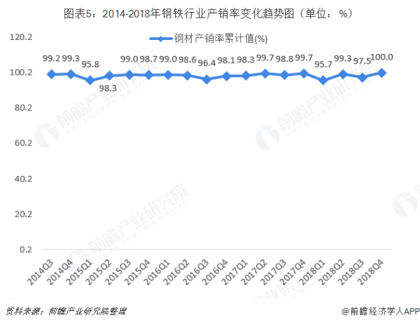 2010年以来,随着钢铁行业的复苏,钢材产能逐渐提高,产销率出现下滑,2014-2018年中国钢铁行业产销率在95%-100%之间波动,2018年1-4季度,从95.7%到100%,波动较大。2018年钢材供需实现基本平衡。