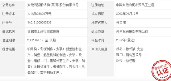 安徽鸿路钢结构(集团)股份有限公司是一家上市公司。目前中国较大的钢结构企业集团之一,拥有安徽合肥、湖北武汉、江西南昌三大生产基地。已具备80万吨的生产能力。现已具有钢结构制作特级资质、钢结构专业承包一级资格证,并获得国家商务部对外承包工程经营资格证,在安徽钢结构行业率先通过了ISO9001质量体系认证、ISO14001环境管理体系认证和OHSAS18001职业健康体系认证。获国家高新技术企业认定、安徽省名牌产品称誉。公司已承建完工项目有格林纳达国家体育馆、沙特阿拉伯王国UAJRAN600T/D水泥窑尾工程、池州体育馆、芜湖会展中心、华润电厂、福州火车站、重庆江北机场、南昌联发广场、印度兰科电厂工程、常州天合工程、东北铝合金等数千余项国内外著名工程。近年来,鸿路还强势进入桥梁钢构,承接了濉溪路管线桥、安哥拉公路桥、合肥市太湖路、望江路、水阳江路人行天桥以及金寨路高架桥习友路匝道、京沪高速青阳港大桥、兴川友谊桥等桥梁工程,早就了一批技术过硬、素质较高的项目施工管理队伍。