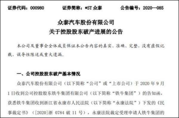 "销量归零、拖欠工资、老板变老赖!"这是近期关于众泰汽车的新闻热点,而就在大家为众泰汽车是否能够熬过2020年之时间,12月23日晚,众泰汽车发布公告称,母公司铁牛集团已经严重资不抵债,且无继续经营的能力,缺乏挽救可能性,已被永康法院裁定终止重整程序,并被宣告破产。