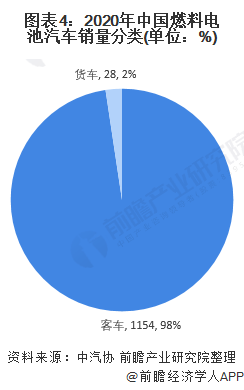 与海外专注于氢燃料电池乘用车的量产不同的是,我国将研发和推广重点放在商用车上。2020年,我国燃料电池汽车销量中,全为商用车。其中,客车销量占比达98%,货车销量占比为2%。截至2020年底,我国氢燃料电池车累计行程超过1亿公里,以氢燃料电池物流车和客车为主。