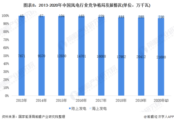 据国家能源局统计数据显示,2013年以来,我国海上风电市场份额稳步提升,2013年,海上风电累计装机容量为45万千瓦,仅占总体的0.58%,到2020年前三季度,增长至750万千瓦,占总体的3.36%。预计未来,海上风电市场份额将进一步提升。