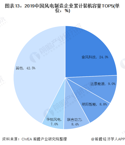 从市场份额来看,截止2019年底,金风科技市场份额24.3%;其后依次为远景能源(9%)、明阳智能(8.8%)、联合动力(8.4%)和华锐风电(7%),前五家制造企业累计装机容量占比合计为57.5%。