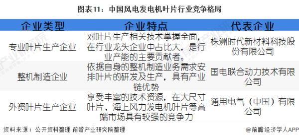 目前,我国风力发电机叶片市场企业可以分类三类,一是专业叶片生产企业,二是整机制造企业,三是外资叶片生产企业。国内主要叶片生产企业有中材科技、中复连众、时代新材等。