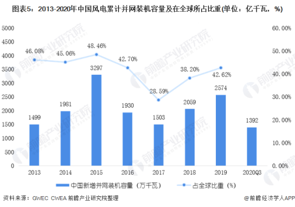 根据GWEC的数据显示,2019年,中国新增并网装机容量为2574万千瓦,新增装机容量在全球比重为42.62%。在2020年前三季度,中国风电新增并网装机1392万千瓦,其中陆上风电新增装机1234万千瓦、海上风电新增装机158万千瓦。从新增装机分布看,中东部和南方地区占比约49%,“三北”地区占51%。