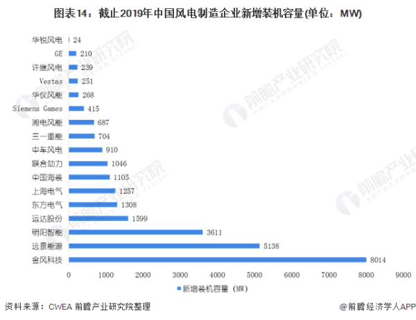 根据CWEA的数据显示,2019年,中国风电有新增装机的整机制造企业共17家,新增装机容量2678.5万千瓦。其中,金风科技新增装机容量达到801.4万千万,其后依次为远景能源(513.8万千瓦)、明阳智能(361.1万千瓦)、运达股份(159.9万千瓦)和东方电气(130.8万千瓦)。