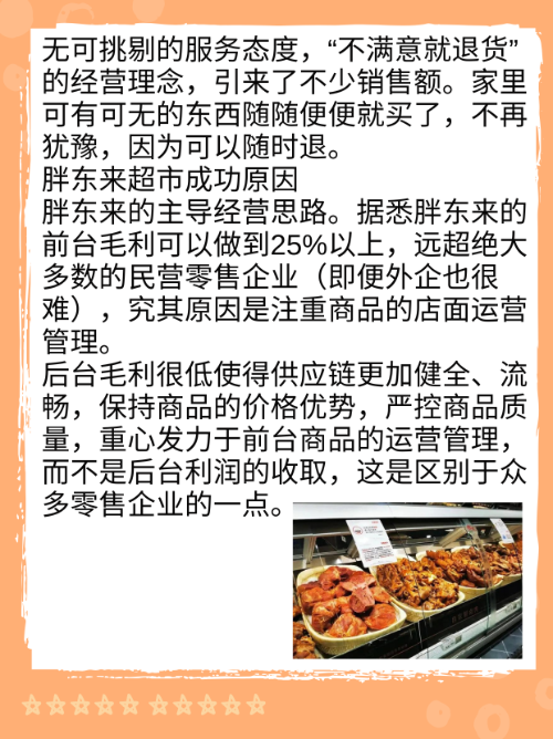 胖东来的主导经营思路。据悉胖东来的前台毛利可以做到25%以上,远超绝大多数的民营零售企业(即便外企也很难),究其原因是注重商品的店面运营管理。