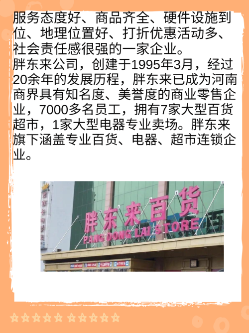 胖东来公司,创建于1995年3月,经过20余年的发展历程,胖东来已成为河南商界具有知名度、美誉度的商业零售企业,7000多名员工,拥有7家大型百货超市,1家大型电器专业卖场。胖东来旗下涵盖专业百货、电器、超市连锁企业。