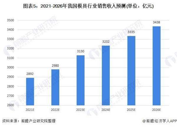 由于模具有工业上游基础产品的地位,前瞻产业研究院将从工业增加值的角度预测我国模具行业未来前景。中国目前的模具行业交易市场发展非常迅猛。工业4.0的到来将中国的模具行业发展推向一个新高度。当前我国工业增加值逐渐上涨,也将带着中国模具行业市场规模保持上涨,预计到2026年中国模具行业销售收入将增长到3438亿元。