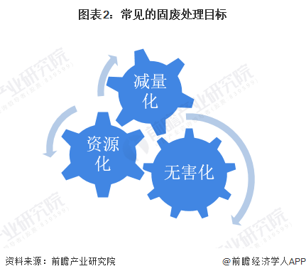 固废处理工程通常执行的是减量化、无害化和资源化三种处理目标。减量化是通过预防减少或避免源头的废物产生量;无害化是对废物进行无害化处理减少毒性;资源化是指对于源头不能削减的废物和消费者产生的废物加以回收、再使用、再循环,使它们回到经济循环中去。发展中国家以无害化为主,经济发达国家一般以资源化为主。我国目前已无害化为主,随着行业技术的发展和国家政策的引导,我国逐步向固废资源利用发展。
