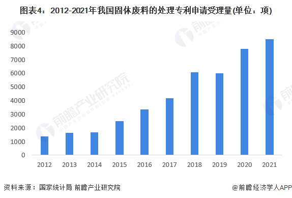 固体废物处理经过不断的进化与发展,目前已经形成多种技术路线,针对不同的固废类型使用多种无害化、减量化、资源化处理方式。而其中支持处理方式效率提升和进步的关键在于技术的研发。根据国家统计局的数据,2012-2020年,我国固体废料的处理专利申请受理量呈现出波动上升趋势。2020年,我国固体废料的处理专利申请受理量达到7793项。结合智慧芽数据,2021年我国固体废料的处理专利申请受理量约为8500项。