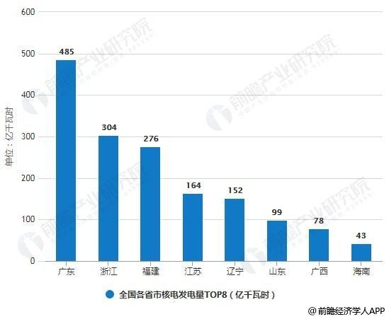 截止至2019年上半年中国核电发电量达到1600亿千瓦时,同比增长23.2%。2019年1-6月,全国进行核电发电八大省份的发电量分别是:广东485亿千瓦时、浙江304亿千瓦时、福建276亿千瓦时、江苏164亿千瓦时、辽宁152亿千瓦时、山东99亿千瓦时、广西78千瓦时、海南43亿千瓦时。