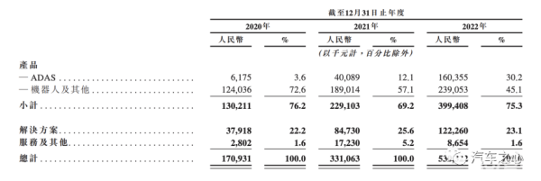 据招股书披露,2020、2021、2022 年,速腾聚创来自产品销售的收入分别达到 1.3 亿、2.29 亿、3.99 亿,分别占总收入的76.2%、69.2%及75.3%。