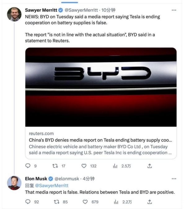 随后马斯克也表示,这个报道是虚假的,特斯拉与比亚迪之间的关系是“积极的”。