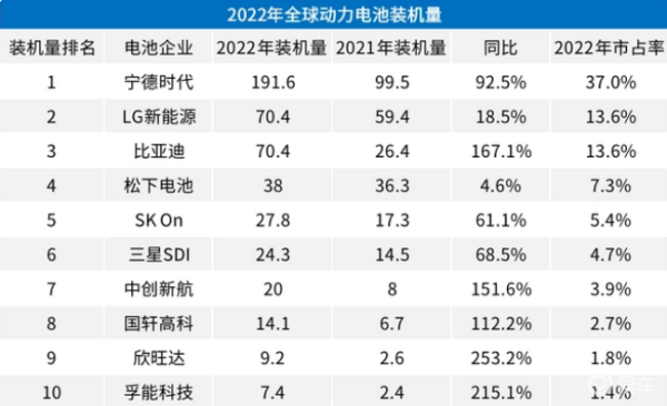 韩国媒体发布这个消息,原因很简单,2022年六家中国动力电池厂商占据了全球60.4%的市场份额,其中宁德时代和比亚迪两家合集就占了50%,而LG占有率只有13.6%。