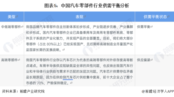 结合上述对我国汽车零部件供给及需求情况来看,我国本土供给能力有所增强,需求也处于逐步恢复的状态。再从国际形势来看,2020年以来,受中美贸易摩擦和新冠肺炎全球蔓延影响,出口停滞,进一步加大了企业经营压力。2021年汽车半导体短缺现象开始在更大范围蔓延,全球多家知名汽车企业均不同程度受到汽车半导体供货不足的影响,部分车型出现生产延误、减产,甚至停产等问题。截至2021年,中国半导体自给率为15%,其中汽车芯片自给率不足5%,车用芯片进口率高达90%以上,汽车芯片产业链供应链自主可控能力急需增强。综上所述,我国中低端零部件基本处于供需平衡状态,而高端零部件呈现供不应求的态势。具体供需平衡分析如下: