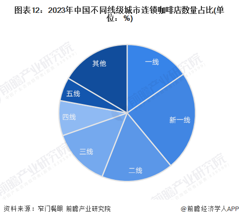 在下游流通市场,咖啡的主要销售渠道包括连锁咖啡店、便利店、快餐店等线下渠道以及电商平台、微信小程序、外卖平台等线上渠道。线下渠道方面,以连锁咖啡店为主导,窄门餐眼数据显示,截至2023年4月,我国连锁咖啡店主要分布在新一线城市,占比达23.58%。