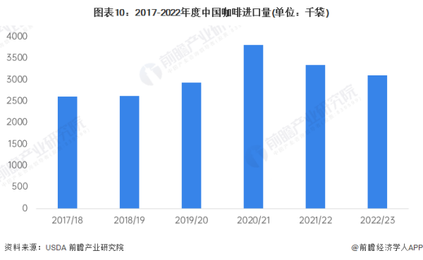 同时,在进口量方面,据美国农业部(USDA)公布的数据显示,2017/18-2020/21咖啡年度,我国咖啡进口量总体呈上升趋势;随后咖啡进口量有所下降,2022/23咖啡年度进口量为3100千袋。整体来看,中国咖啡产业较依赖于进口,进口量约为国内产量的1.5倍。