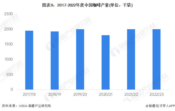 据美国农业部(USDA)于2023年6月底发布的《全球咖啡市场与贸易》,2022/23咖啡年度中国咖啡产量为2000千袋,每袋为60KG,约计12.0万吨,与上一咖啡年度持平。