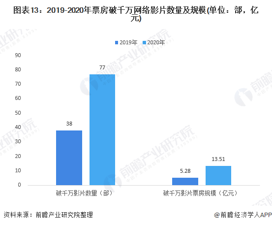 据《2020年度优酷网络电影数据报告》披露,2020年网络院线共发行的网络影片中票房破千万的影片共有77部,较2019年增长一倍有余;这些影片共实现票房13.51亿元,较2019年增长155.87%。
