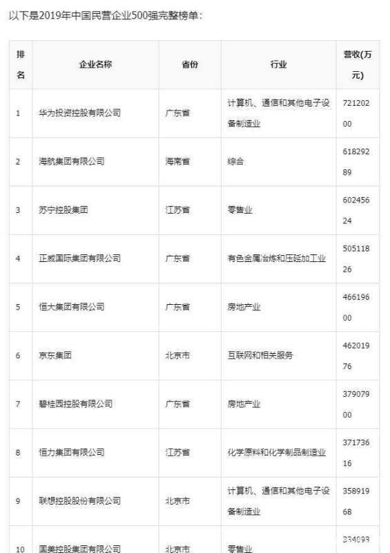 前阵子在青海西宁召开的《2019中国民营企业500强峰会》中,公布了2019年中国民营企业500强报告。似乎毫无悬念的,华为投资控股有限公司以7212.02亿元的营业收入蝉联榜首。华为已经是连续第四年蝉联榜单第一位置了。而紧随其后的是海航集团和苏宁控股集团,营收分别对应6182.92亿元和6024.56亿元。--如下是榜单前10位,大部分都是我们所熟知的民营企业。