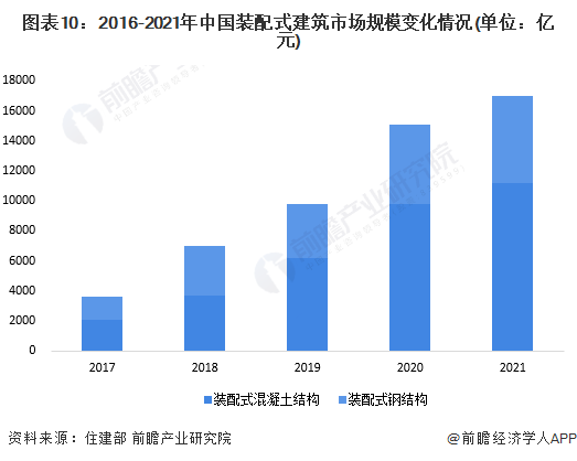 根据《装配式建筑工程消耗量定额》,装配式混凝土结构建筑平均造价约为2284元/平方米,装配式钢结构建筑平均造价约为2776元/平方米,根据国家住建部发布历年两种类型两种新开工装配式建筑面积占比,进而测算出近几年装配式建筑市场规模。初步估算,2021年我国装配式建筑市场规模或达到17021亿元,其中,装配式混凝土结构市场规模约为11192亿元,装配式钢结构市场规模约为5830亿元。