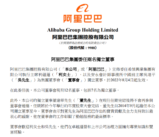 阿里巴巴集团控股有限公司宣布希慎兴业集团有限公司执行主席利蕴莲,以及安永会计事务所中国前主席吴港平为集团的独立董事,目前该公司的董事会成员共有12名,其中7名为独立董事,利蕴莲目前任职于香港联交所上市的恒生银行有限公司,曾在纽约,伦敦,悉尼等地担任投资银行的执行董事,而吴港平则担任多家上市公司的独立非执行总裁以及审计委员会主席。