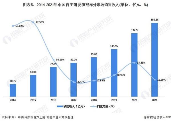 近年来,我国自主研发的游戏产品出海规模逐年攀升,海外影响力、海外市场份额、全球用户规模不断扩大。“走出去”的范围从港澳台地区、东南亚地区为主逐步转向全球,在发力美国、日本、韩国以及欧洲等成熟市场的同时积极探索中东、印度、俄罗斯、巴西等新兴市场。出海游戏类型与题材也逐渐丰富。2021年我国自主研发游戏出海保持增长势头,自主研发游戏海外市场实际销售收入180.18亿美元,同比增长16.59%。