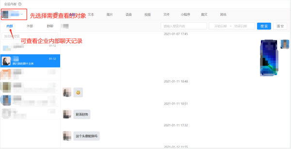 开通接口后,可以联系企小码配置会话存档功能,配置完成后,即可查看会话存档的效果了。