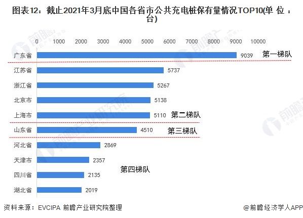 截止2021年3月底,广东省拥有最多公共充电桩,共计9039台,遥遥领先于其它省份。入围前十大公共充电桩保有量的省份还包括江苏省、浙江省、北京市、上海市、山东省、河北省、天津市、四川省和湖北省。