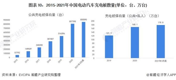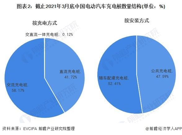 而按安装地点划分,截止2021年3月底,我国随车配建充电桩达到93.7万台,占比为52.41%;公共充电桩为85.1万台,占比达到47.59%。
