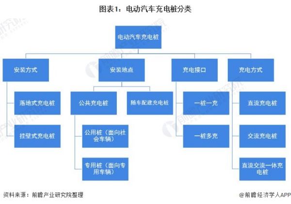 电动汽车充电桩按照安装方式分为落地式充电桩、挂壁式充电桩;按照安装地点,可分为公用充电桩和随车配建充电桩;公共充电桩又可分为公用桩和专用桩,公用桩面向社会车辆,专用桩面向专用车辆;按照充电接口的多少可分为一桩一充和一桩多充;按照充电桩充电方式,分为直流充电桩、交流充电桩和交直流一体充电桩。