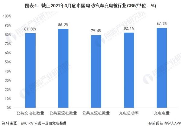 同时,目前我国电动汽车充电桩市场集中度高。截止2020年底,全国规模化运营商(充电站保有量大于等于100座)仅有25家。截止2021年3月底,无论是在公用充电桩数量、专用充电桩数量、直流桩数量、交流桩数量还是在充电总功率和充电电量方面,前五大运营商均占据了超过79%以上的市场份额。