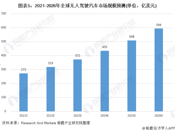 根据Statista数据显示,2015年到2019年我国无人驾驶汽车行业市场规模扩张迅速,2019年我国无人驾驶汽车市场规模达到98.4亿元,2020年受疫情影响市场规模将有所下滑,前瞻估计为95.4亿元。在Research And Markets的预测下,2021年全球无人驾驶汽车的市场规模将达273亿美元,2026年全球无人驾驶汽车市场规模将达到594亿美元,年复合增长率为16.84%。