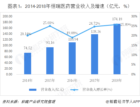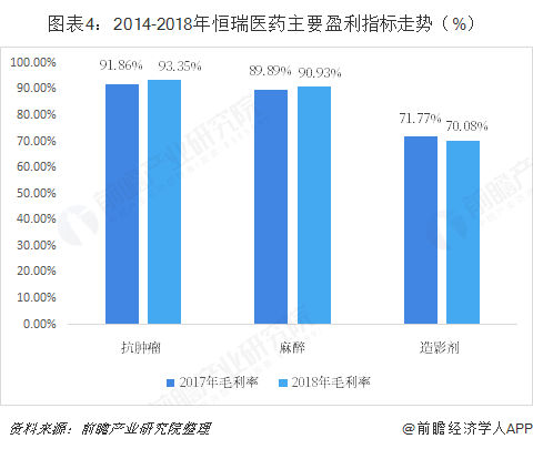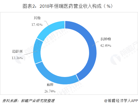 从营业收入及其增长来看,2018年均为近五年最高值,分别为174.18亿元和25.89%。分产品来看,公司三大系列产品对公司的营收贡献合计82.59%,其中抗肿瘤药营收占比42.49%;麻醉用药营收占比26.74%;造影剂营收占比13.36%。