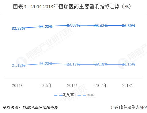 从近五年恒瑞医药的毛利率指标变化来看,总体上保持在82%以上,近四年更是均在86%左右,产品盈利性强。分产品来看,公司三大系列产品中,2018年抗肿瘤药和麻醉药的毛利率均较上年有所增长,而造影剂的毛利率略有下降。