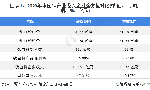 钛白粉是我国钛产业中产销量占比最高的产品,几十年来,市场规模不断壮大。目前,中国钛白粉市场的龙头企业是龙佰集团和中核钛白,2020年,龙佰集团和中核钛白的钛白粉产量分别达81.72万吨和31.76万吨,分别为中国钛白粉生产的第一和第二名。