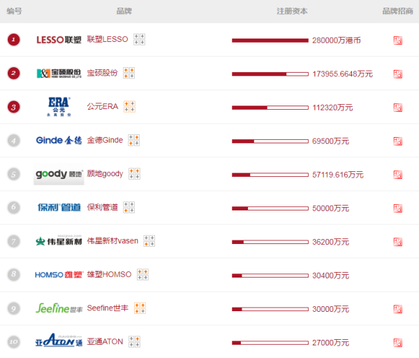 浙江伟星新型建材股份有限公司,管材十大品牌,上市公司,中国塑料管道专业委员会副理事长单位,鸟巢、水立方、世博中国馆等国家重点项目供应商,国内最早、规模最大的塑料管道生产企业之一。