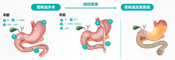 除一部分不满足手术指征无法手术的患者外,还有很多患者对减重手术需要改变脏器结构而望而却步。目前国内已有创新型内镜下介入治疗技术 ——“胃转流支架系统”,不同于手术会对人体造成损伤,其可以通过无痛胃镜进行“胃转流支架系统”的置入膜管,隔离食物与肠壁,食物从膜管中通过,从而减少肠壁吸收。据目前临床结果显示3个月后取出,患者体重、糖化血红蛋白、肝脏硬度等代谢性疾病指标均得到显著下降。