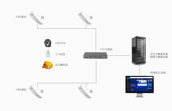 UWB定位系统大致分为位置感知层、网络传输层和定位应用层,主要包括:定位引擎服务器、智能终端、POE交换机、UWB基站、UWB标签、UWB模块、软件接口等。