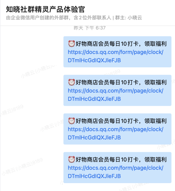 第二步:将打卡链接发至客户群,引导客户参与打卡,领取福利。如果你有多个客户群,则可以通过群发消息一键发送。你可以在「知晓社群精灵 - 定时群发」上编辑相应的文案和群发对象,系统将根据设置的时间群发到指定群。