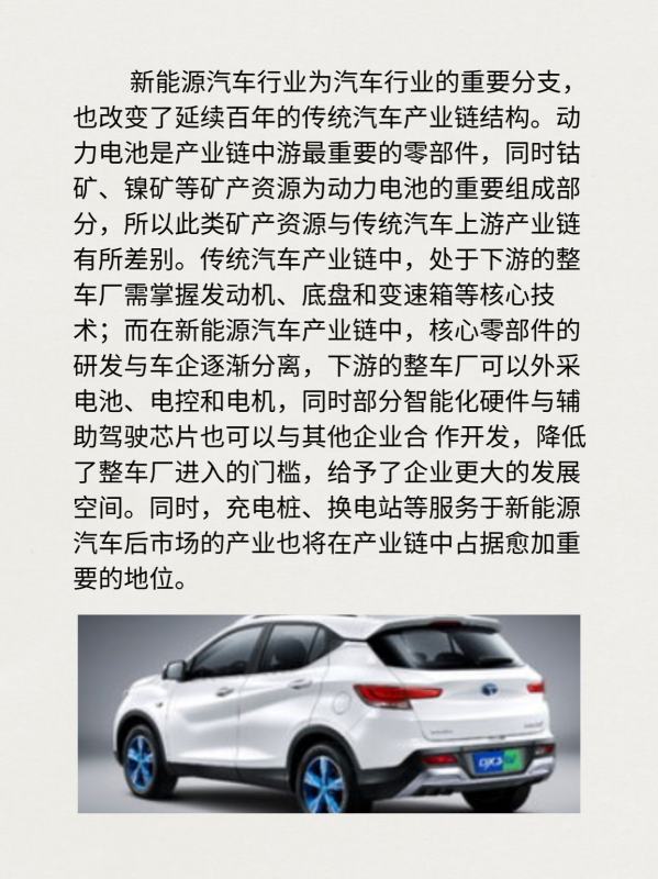 新能源汽车行业为汽车行业的重要分支也改变了延续百年的传统汽车产业链结构。动力电池是产业链中游最重要的零部件,同时钻矿、镍矿等矿产资源为动力电池的重要组成部分,所以此类矿产资源与传统汽车上游产业链有所差别。传统汽车产业链中,处于下游的整车厂需掌握发动机、底盘和变速箱等核心技术;而在新能源汽车产业链中,核心零部件的研发与车企逐渐分离,下游的整车厂可以外采电池、电控和电机,同时部分智能化硬件与辅助驾驶芯片也可以与其他企业合 作开发,降低了整车厂进入的门槛,给予了企业更大的发展空间。同时,充电桩、换电站等服务于新能源汽车后市场的产业也将在产业链中占据愈加重要的地位。